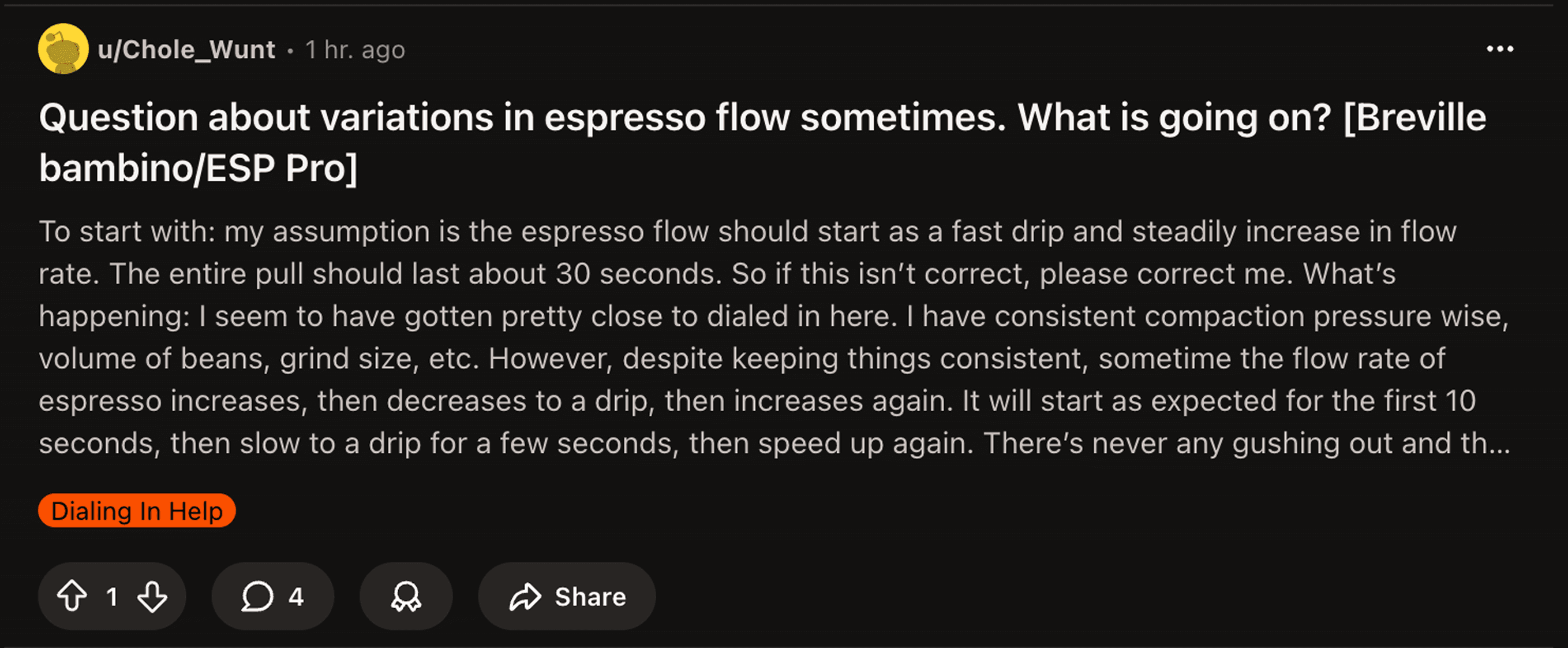 It’s such a common struggle that r/espresso on Reddit has a dedicated “Dialing In Help” tag for posts where users ask others how to fix their espresso shots. Thousands of home baristas share photos, brew settings, and tasting notes hoping someone can tell them why their espresso tastes sour, bitter, or just… wrong.